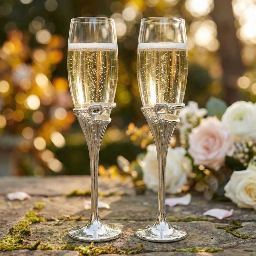 Perfectas para bodas, aniversarios y celebraciones especiales, estas copas son un accesorio para tu boda religiosa o civil elegante y moderno. Se presentan en una elegante caja de regalo listas para ser entregadas como un obsequio memorable. Disfruta de tu champán o vino espumoso favorito con este juego que combina la belleza del cristal con el brillo del metal y la pedrería.