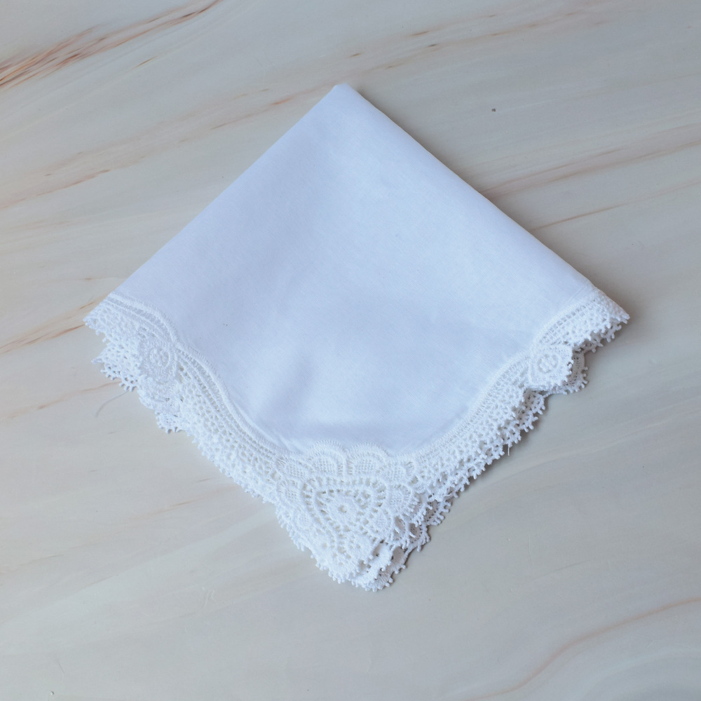 El pañuelo elaborado en 100% algodón de alta calidadcon fino bordado de encaje. La concha es natural decorada con un moño en juego y un pequeño detalle de pasalistón con cristales.
