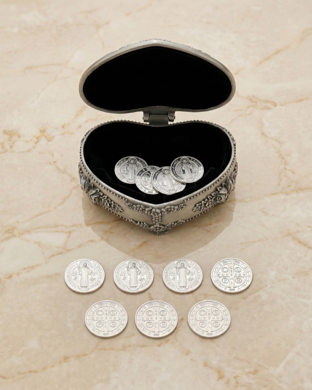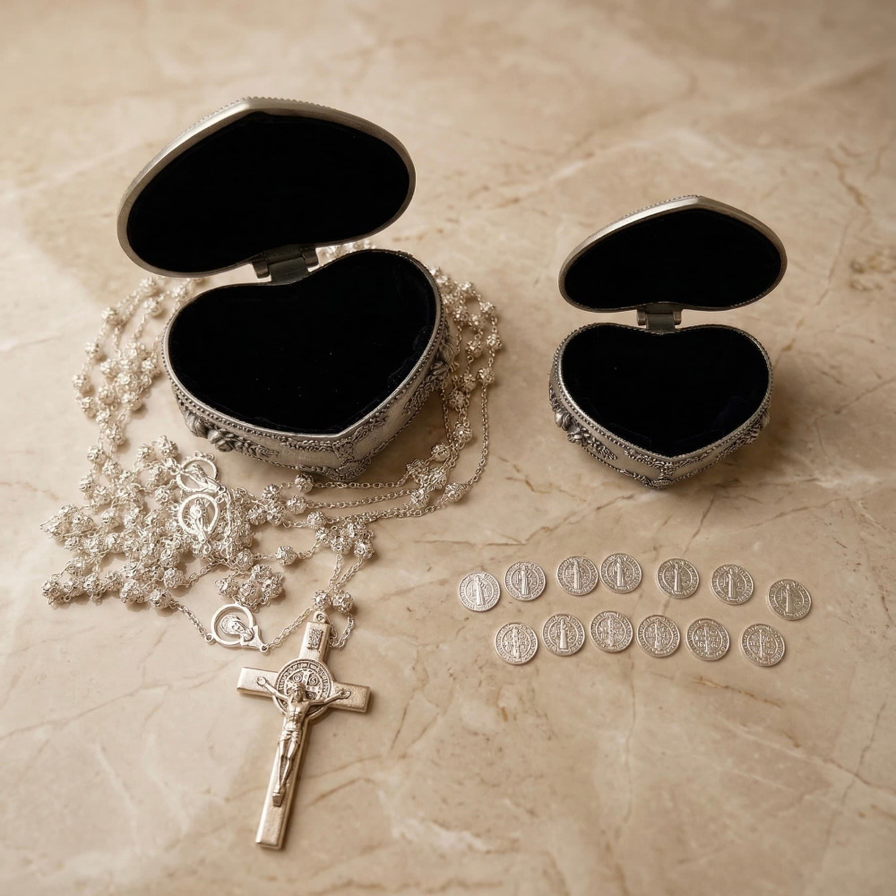 Preparar los símbolos de su ceremonia es un paso lleno de ilusión. Este precioso kit matrimonial está pensado para que no le falte ningún detalle en el altar. Incluye un hermoso lazo Bella Luz plateado con cuentas brillantes y una cruz de San Benito, junto con trece arras chicas de plata fina a juego. Para guardar estas piezas tan importantes, el paquete trae dos cofres en forma de corazón, uno grande y uno pequeño, ambos con un lindo decorado de rosas en relieve y un acabado vintage muy elegante. Es un conjunto precioso, resistente y de excelente calidad. Tenga la completa tranquilidad de que recibirá un trabajo impecable, muy bien protegido en su envío y totalmente listo para lucir en su boda.