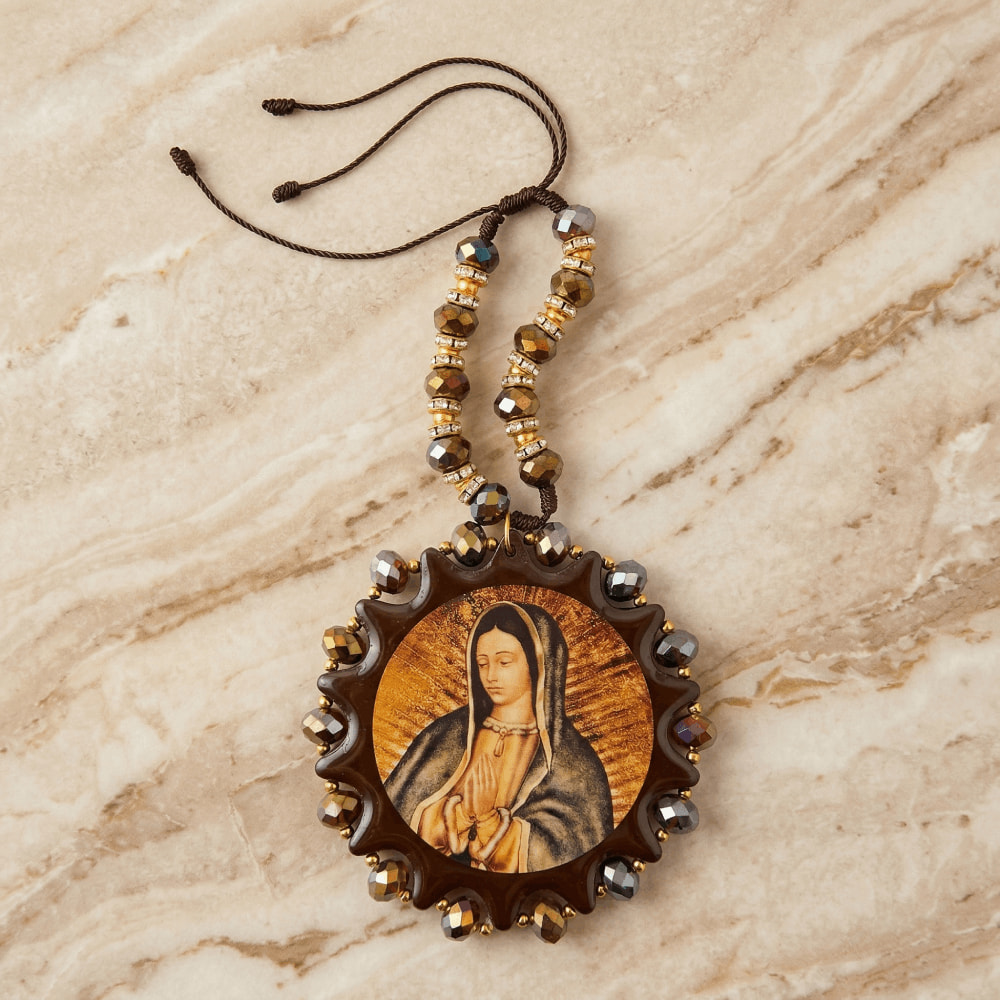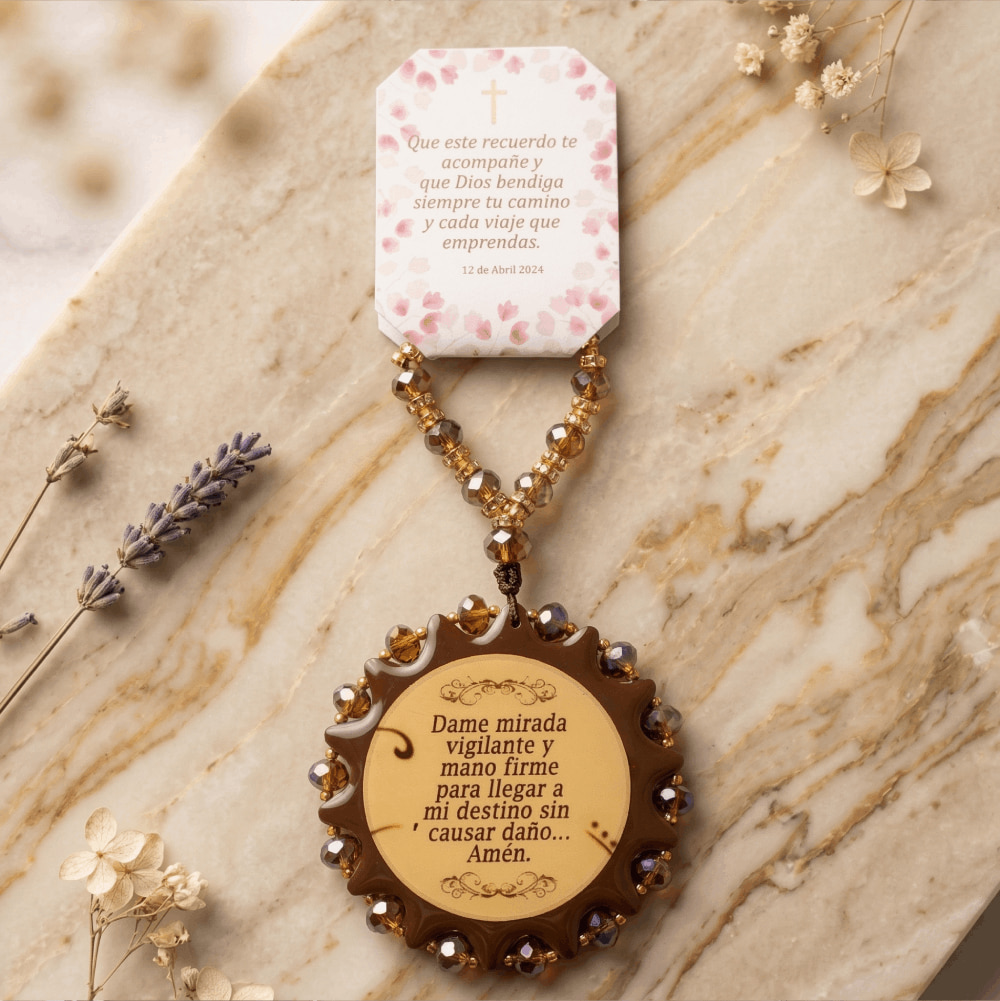 No hay nada como sentirnos protegidos cuando salimos de casa, y este detalle está pensado para acompañar a sus seres queridos en cada trayecto. Esta hermosa bendición para coche es un recuerdo muy especial y útil. Cuenta con un medallón circular que lleva la tierna imagen de nuestra Virgen de Guadalupe, rodeada de cuentas brillantes en un tono café muy elegante que combina con todo. Cuelga de una tirita hecha con los mismos materiales y unos toques dorados que la hacen lucir preciosa. Lo más lindo es que incluye una tarjetita personalizada con los datos de su evento, como el nombre del festejado y la fecha. Es un regalo lleno de fe que sus invitados de verdad van a atesorar y colocar en su auto con mucho cariño.