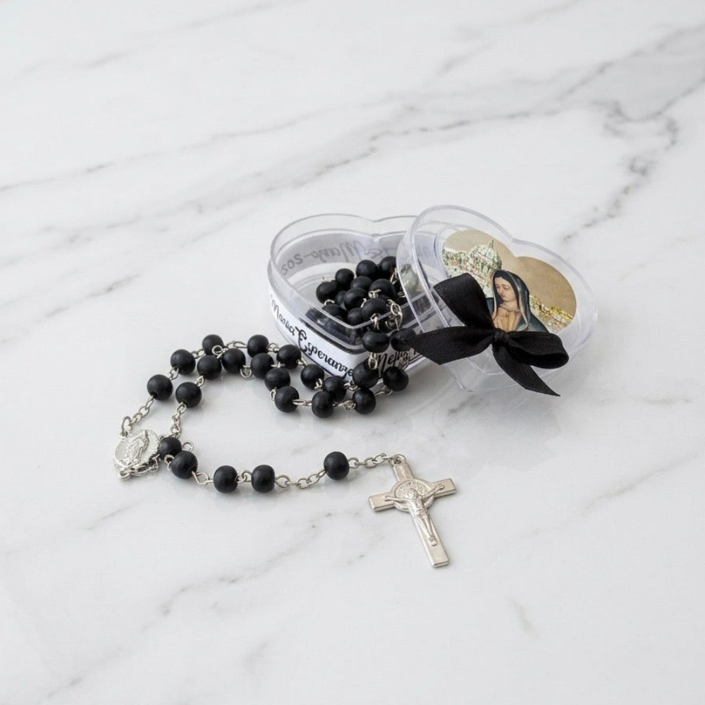 Agradecer a quienes nos acompañan en momentos difíciles requiere de un detalle lleno de respeto y cariño. Este tierno recuerdo luctuoso incluye un hermoso rosario guardado dentro de una linda cajita transparente en forma de corazón. En la parte superior, lleva una delicada imagen de la Virgen y un respetuoso moñito negro. Para hacerlo muy especial, la cajita se rodea con un listón personalizado con el nombre de su familiar. Tenga la completa tranquilidad de que recibirá en su hogar un trabajo impecable, cuidadosamente elaborado y totalmente listo para entregar a sus acompañantes, brindándole total seguridad en su compra.
