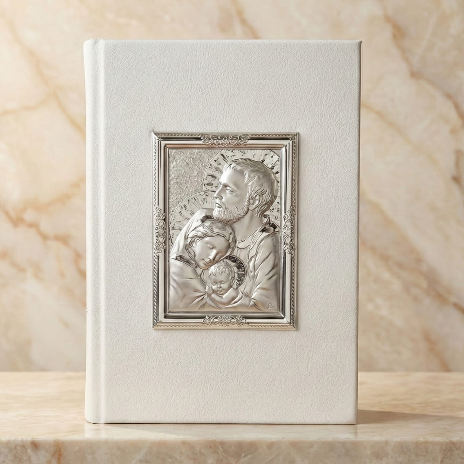 Forrada en piel genuina blanca con un delicado canto dorado, su diseño transmite pureza, elegancia y un profundo valor espiritual. En la portada resalta una placa de plata laminada importada de Italia con la imagen de la Sagrada Familia, trabajada a mano por artesanos expertos. Este detalle único recuerda la importancia de la familia en la fe cristiana y realza la exclusividad de cada pieza.