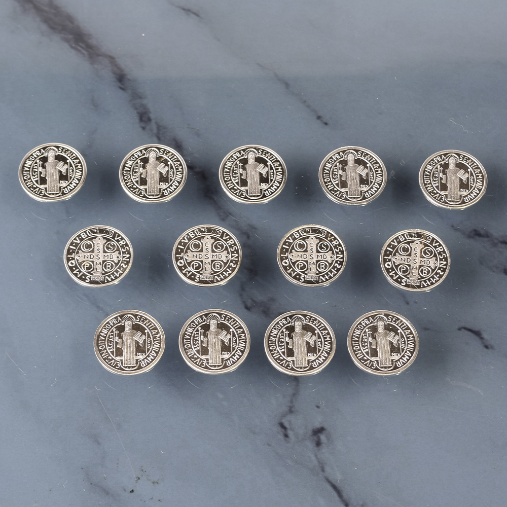 Por otra parte, las arras para boda religiosa tienen la imagen grabada de San Benito, en el reverso tiene las iniciales (C.S.S.M.L.) que significan: Crux Sacra Sit Mihi Lux, “La santa Cruz sea mi luz”; la imagen de San Benito es simbólica de protección contra el mal.