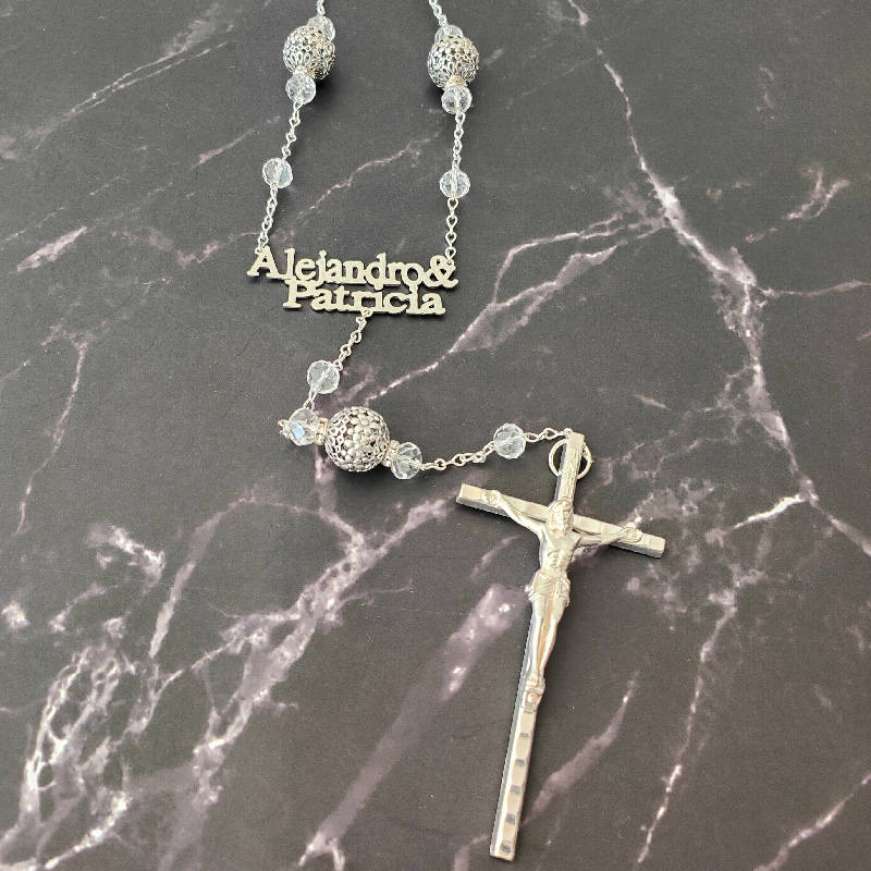 Nuestro Lazo tiene un diseño estilo vintage, con hermosas cuentas y detalles en cristal austriaco, cuenta con Certificado de exclusividad ya que la cruz es importada de Italia. Con un toque de elegancia se incluyen 2 nombres (una del novio y una de la novia).